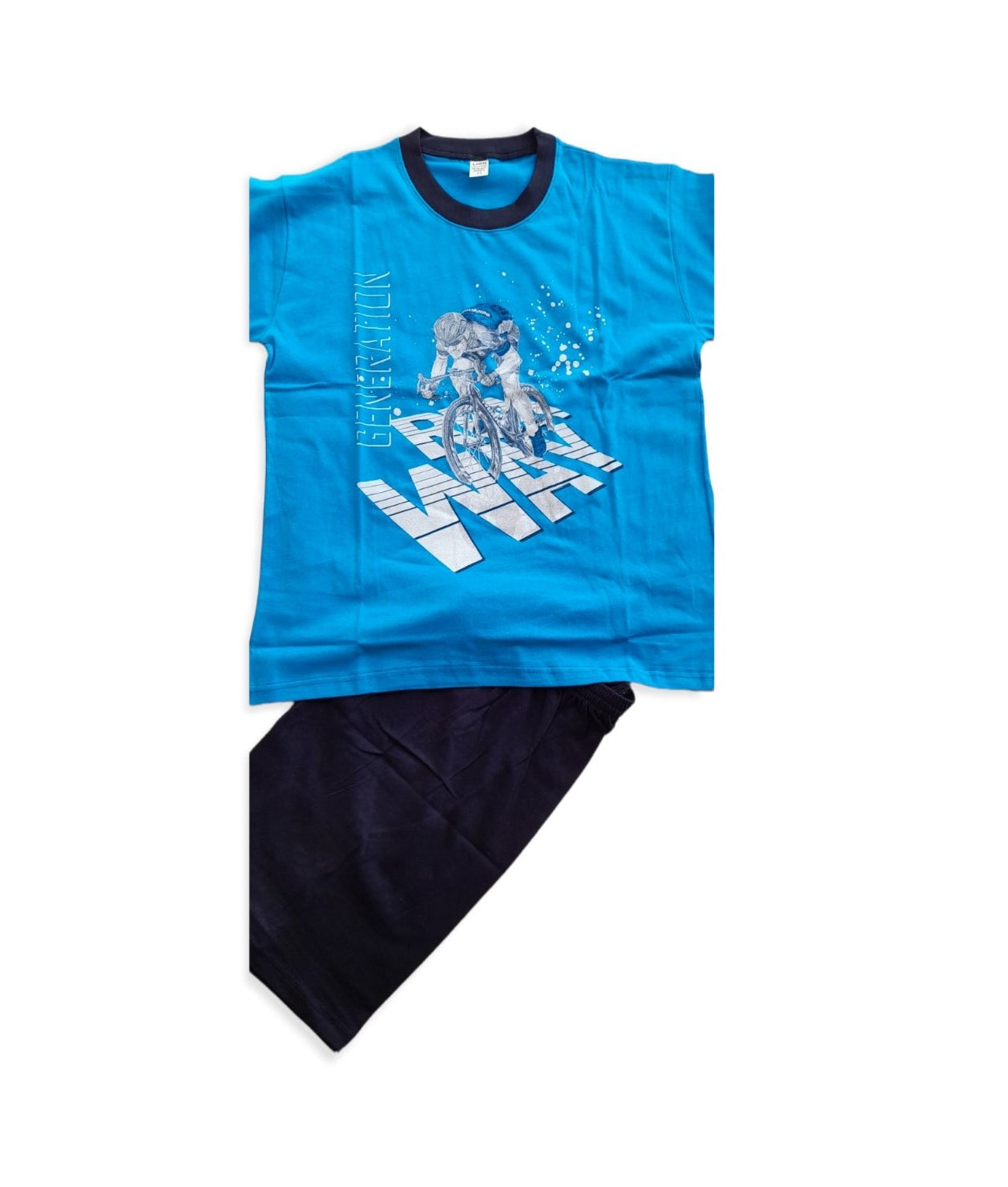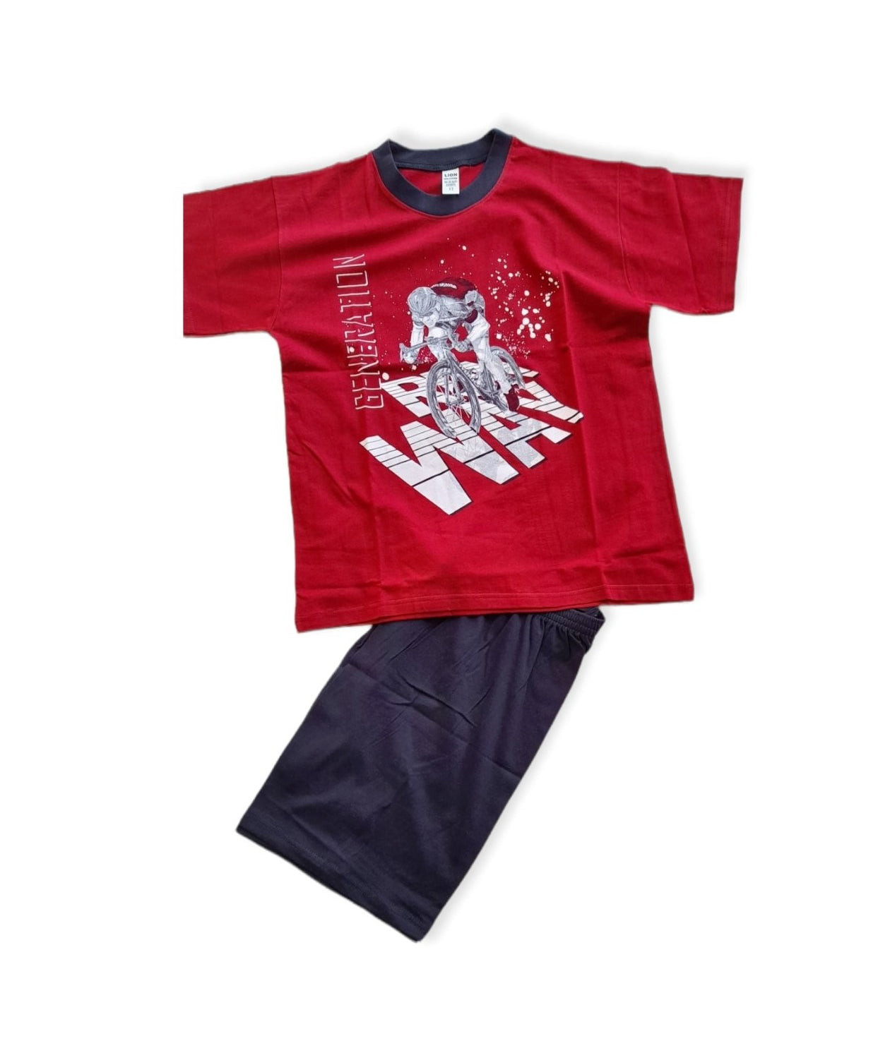 Βαμβακερό πιτζαμάκι 100%. Με κοντό μανίκι και βερμούδα. Με τύπωμα ποδηλάτης σε 4 ωραία χρώματα