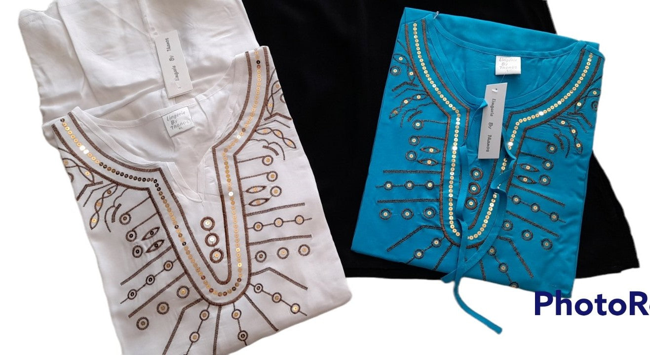 Καφτάνι σε μέτριο μήκος viscose. Λαιμός βε με πούλια κεντημένη και μανίκι 3/4, σκίσιμο στο πλάϊ. Άνετο και δροσερό είτε ως μπλουζο-φόρεμα με κολάν ή τζην αλλά και σκέτο για την παραλία ή homewear