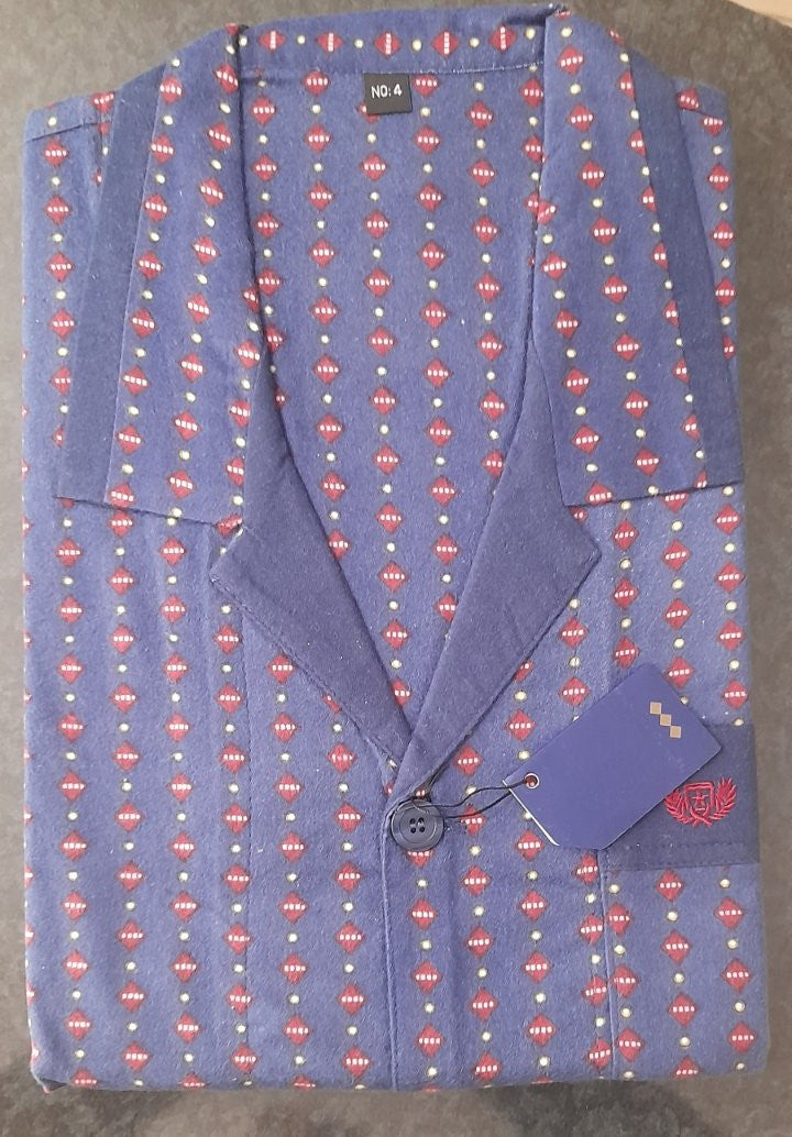 Ανδρική πιτζάμα 100% βαμβακερή φανέλα, ελληνικής κατασκευής. Γιακάς και κουμπί ως κάτω. Κουμπί και λάστιχο στο παντελόνι πάντα στην ίδια κλασσική γραμμή και ντεσέν με το σακκάκι.