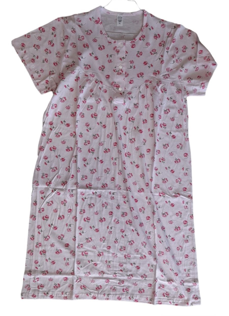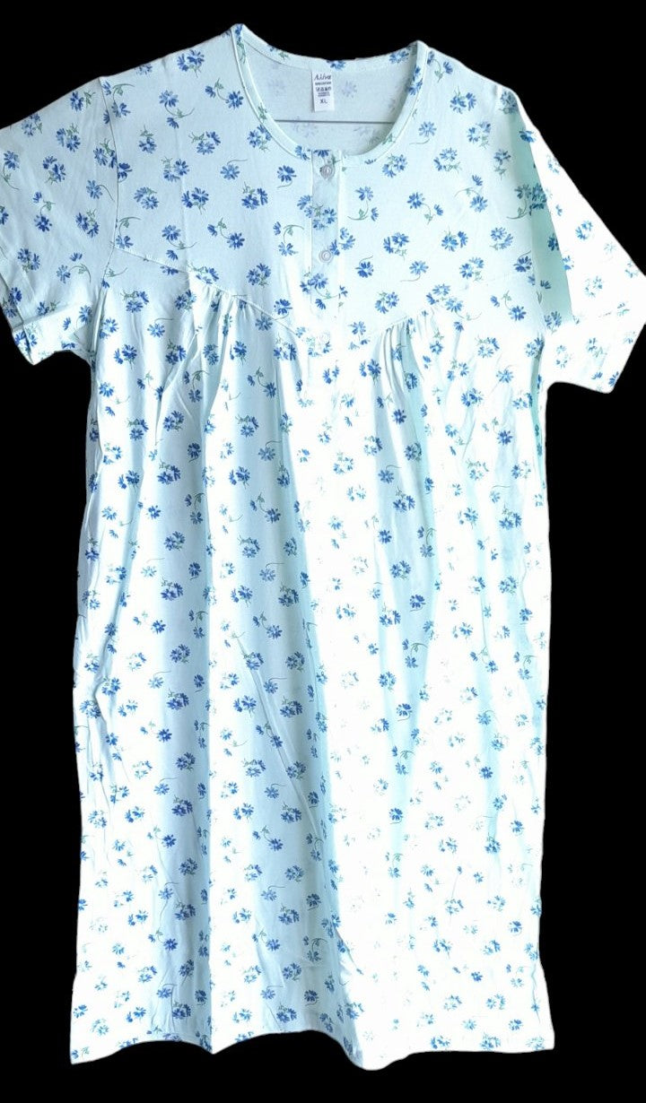 Γυναικείο μακό 100% βαμβακερό κλασικό νυχτικό με φλοράλ σχέδιο. Έχει βαθιά πατιλέτα με τέσσερα κουμπιά και κοντό μανίκι. Σε άνετη γραμμή Α για να καλύπτει τα μεγαλύτερα μεγέθη.