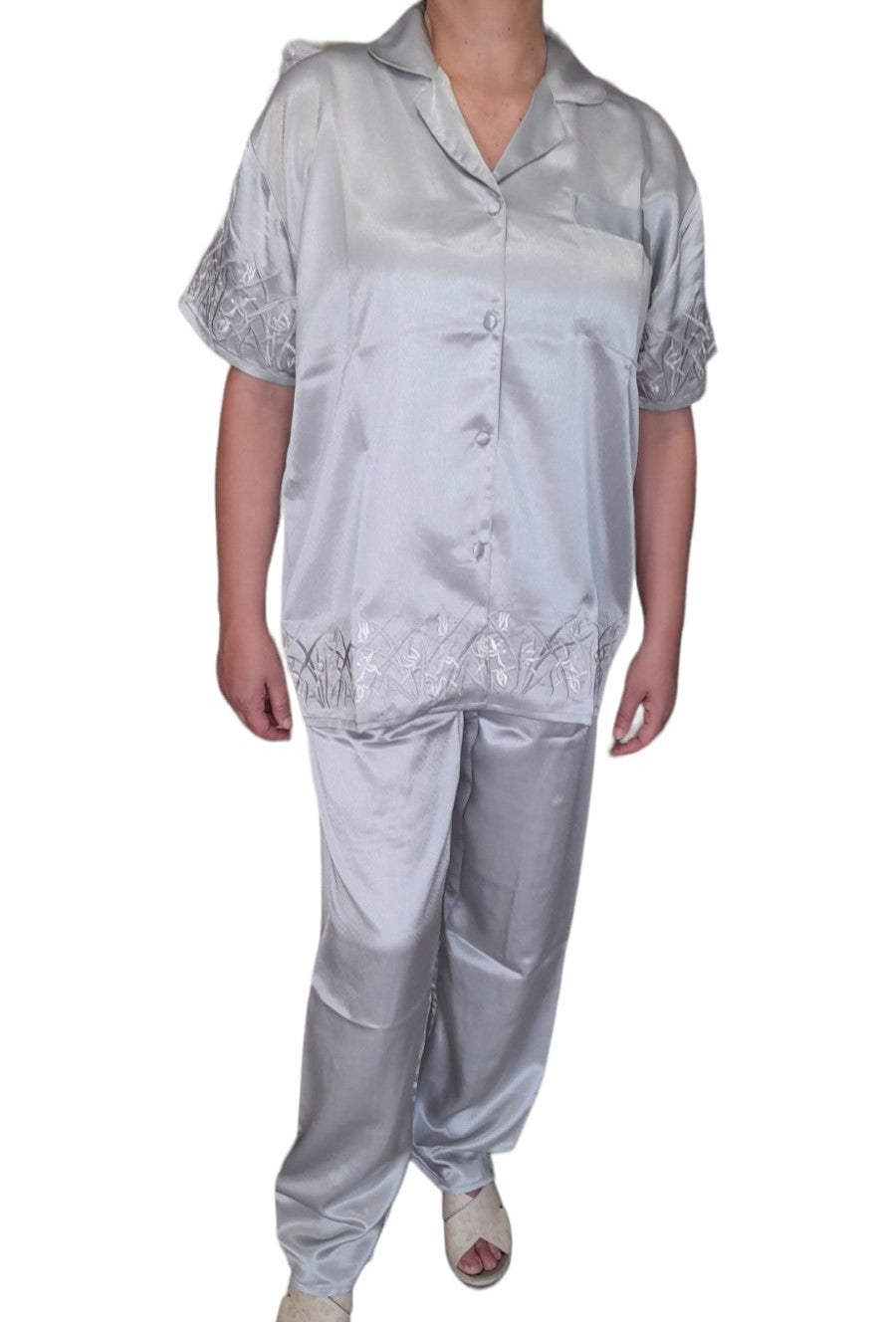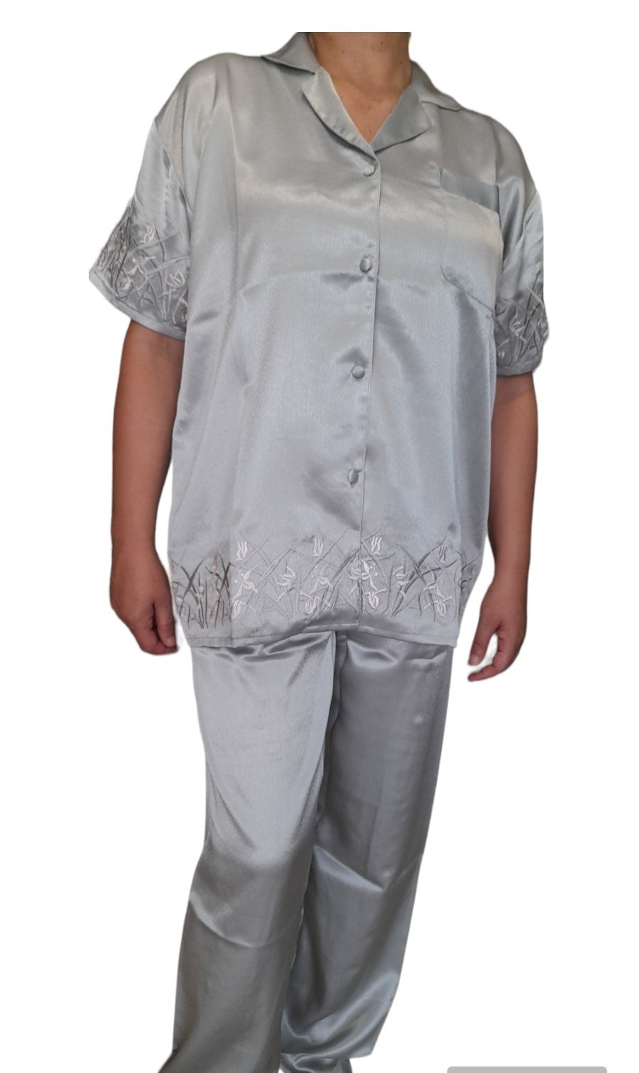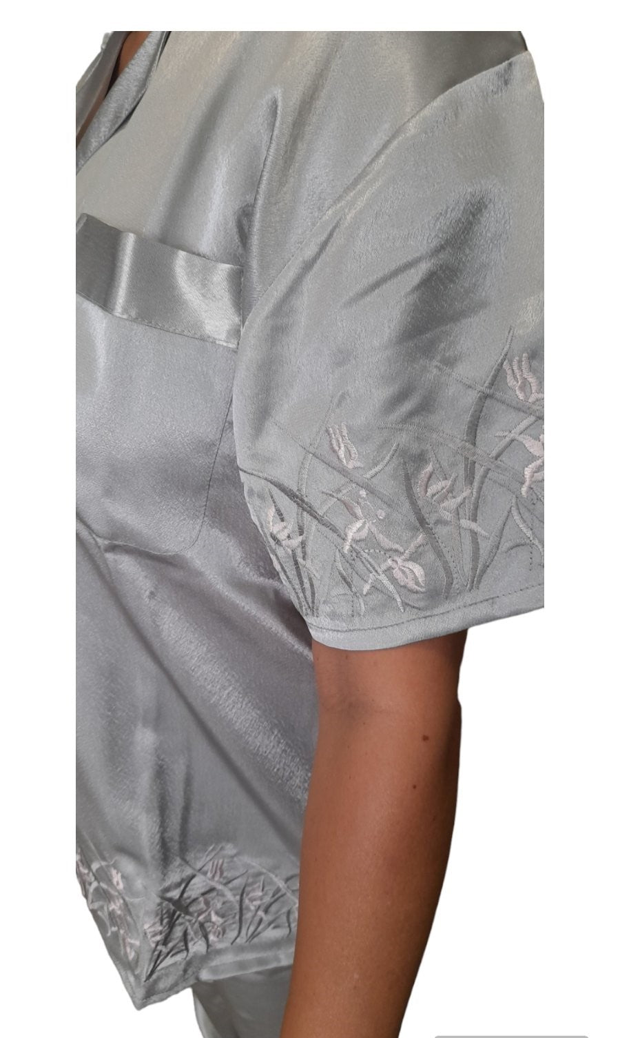 Σατέν πιτζάμα γυναικεία με κοντό μανίκι και μακρύ παντελόνι. Εξαιρετική ποιότητα κατασκευής και τέλεια εφαρμογή. Πλούσιο πατρόν στα μεγέθη. Λεπτομέρεια στο μανίκι και μπορντούρα στο τελείωμα με κέντημα