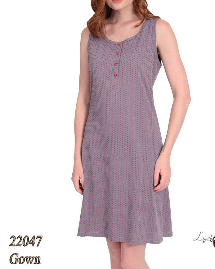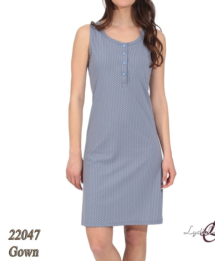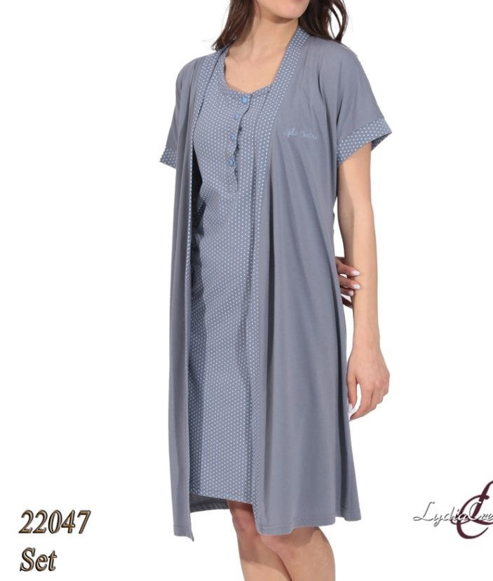 Μοντέρνο, άνετο και δροσερό αμάνικο νυχτικάκι, σε εξαιρετική βαμβακερή ποιότητα. Πατιλέτα με τρία κουμπιά και "χαμόγελο" λαιμόκοψη. Η ρόμπα είναι δετή στη μέση και με κοντό μανίκι. Ιδανικό και για μαιευτήριο ή κλινική, αδιάφανο και κομψό. Σε υπέροχο γκρι-σιελ φόντο από τη Lydia Creation