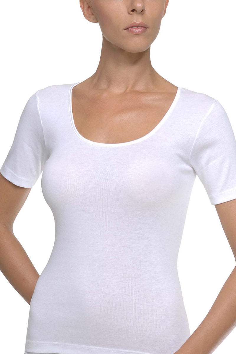Φανέλα με κοντό μανίκι και στρογγυλή λαιμόκοψη με σατέν φάσα. Εξαιρετική ποιότητα από πενιέ βαμβάκι και modal, σε πλέξη rib 1X1. Χωρίς πλαϊνές ραφές, χαρίζουν άνεση και μια κομψή εμφάνιση