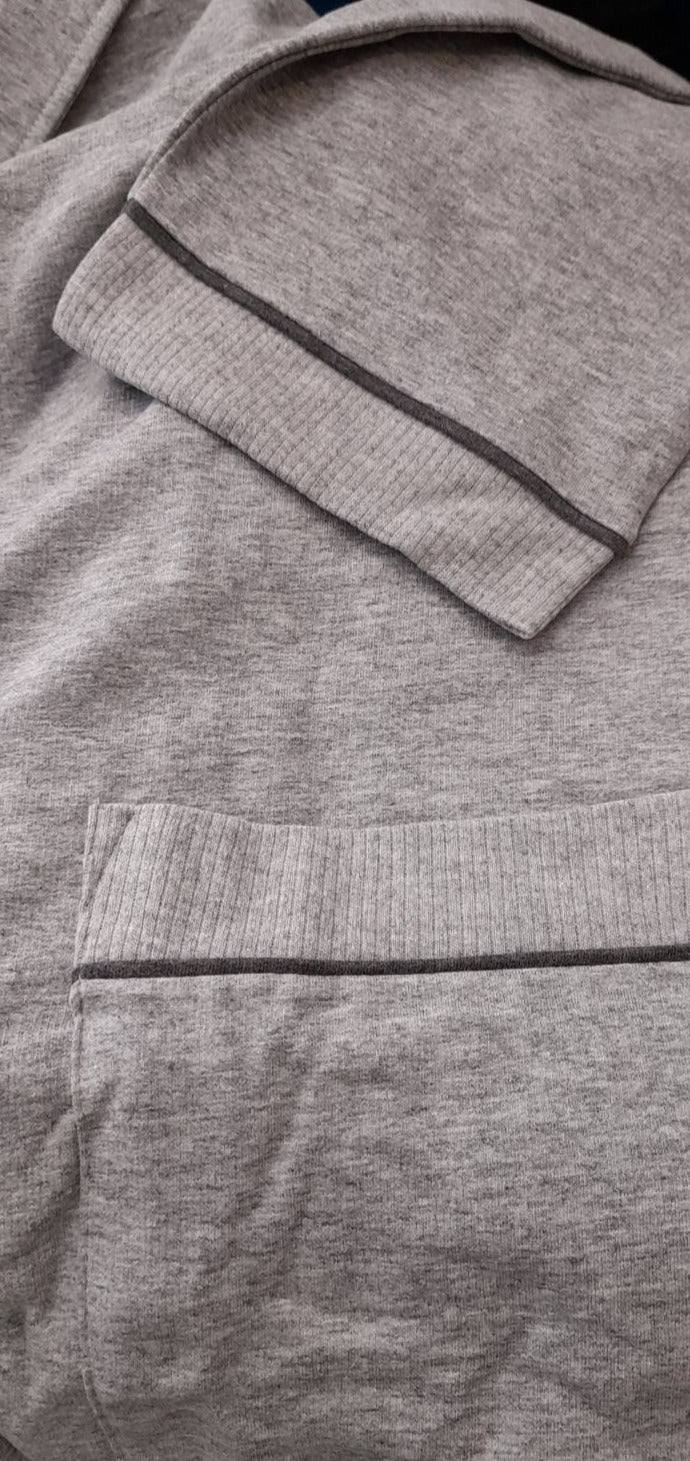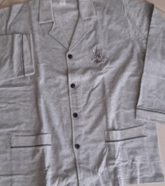 Ανδρική βαμβακερή πιτζάμα. Εξαιρετική ποιότητα, αντοχή στην καθημερινή χρήση. Βαμβακερό φούτερ 100%, με κουμπί όλο και δύο τσέπες, γιακάς. Σε γκρι με ανθρακί παντελόνι. Εξαιρετική ποιότητα, τέλεια εφαρμογή, μια πιο νεανική πρόταση για πιτζάμα με κουμπί ως κάτω.