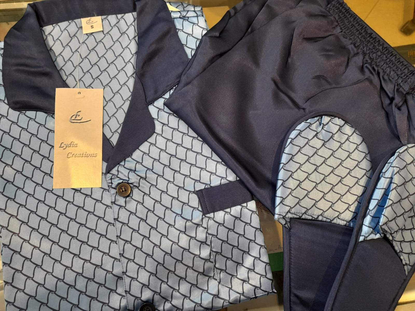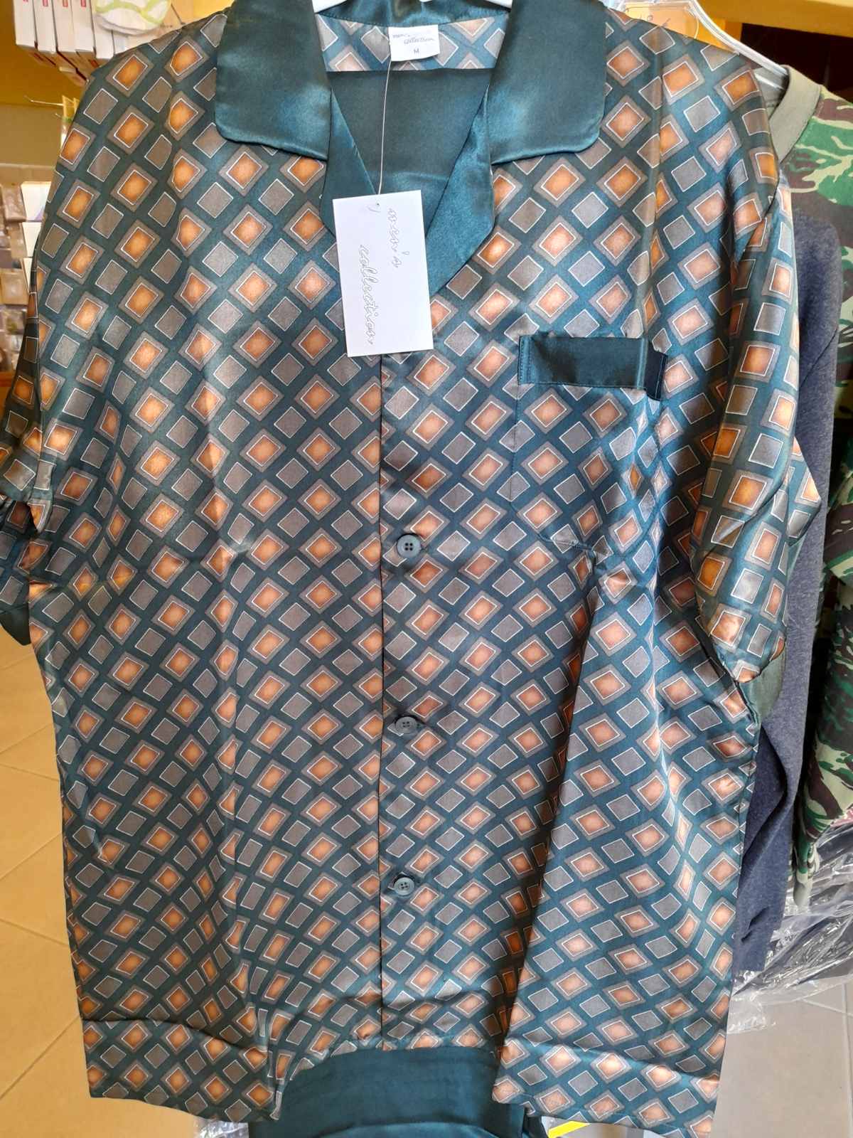 Ανδρική πιτζάμα Σατέν κοντό μανίκι, μακρύ παντελόνι. Κλασική γραμμή με άνετα μεγέθη, λάστιχο και κουμπί στο παντελόνι, 3 τσέπες στο σακάκι. Κουμπί ως κάτω με γιακαδάκι. Παντελόνι μονόχρωμο. Πολυέστερ - σατέν εξωτερικά με καρώ σχέδιο.
