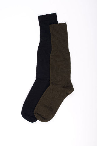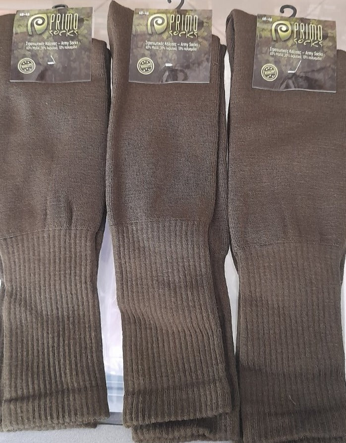 4-pack Μακρύ καλάμι κάλτσες μάλλινες και άνετες, μακριές για να καλύπτουν το μήκος του άρβυλου. Διατίθενται τέσσερα ζεύγη μαζί, μέγεθος 40-46, one size fits all, χρώμα χακί, σύνθεση 60% μαλλί, 30% ακρυλικό, 10% πολυαμίδιο