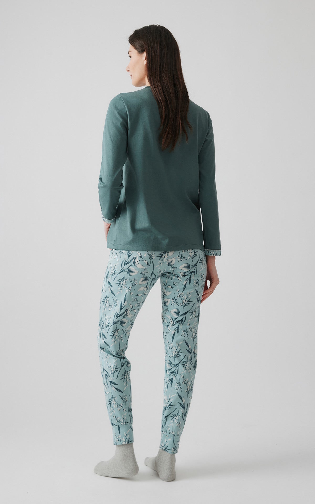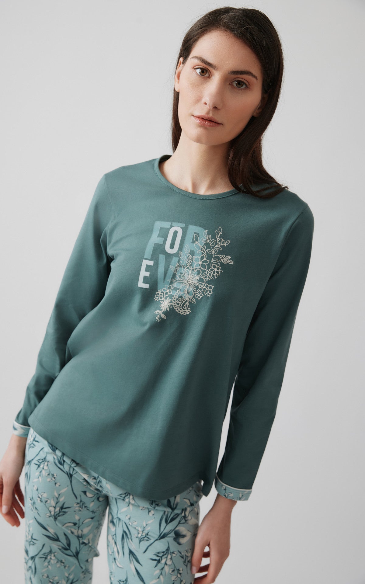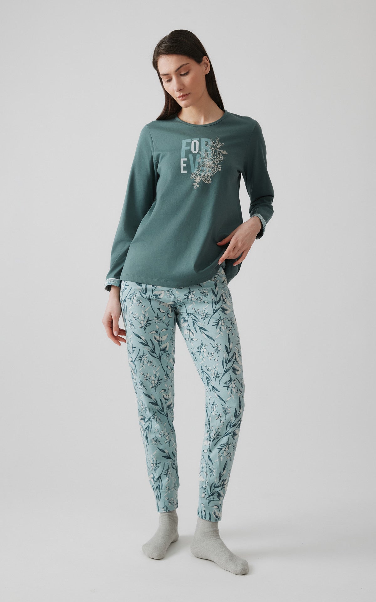 • Χειμερινή πυζάμα από 100% βαμβακερό ύφασμα, υψηλής ποιότητας. Το σετ περιλαμβάνει μπλούζα μακρυμάνικη με στρογγυλή λαιμόκοψη, τύπωμα στο στήθος και μακρύ παντελόνι, τυπωμένο floral, με μπάσκες στα τελειώματα.