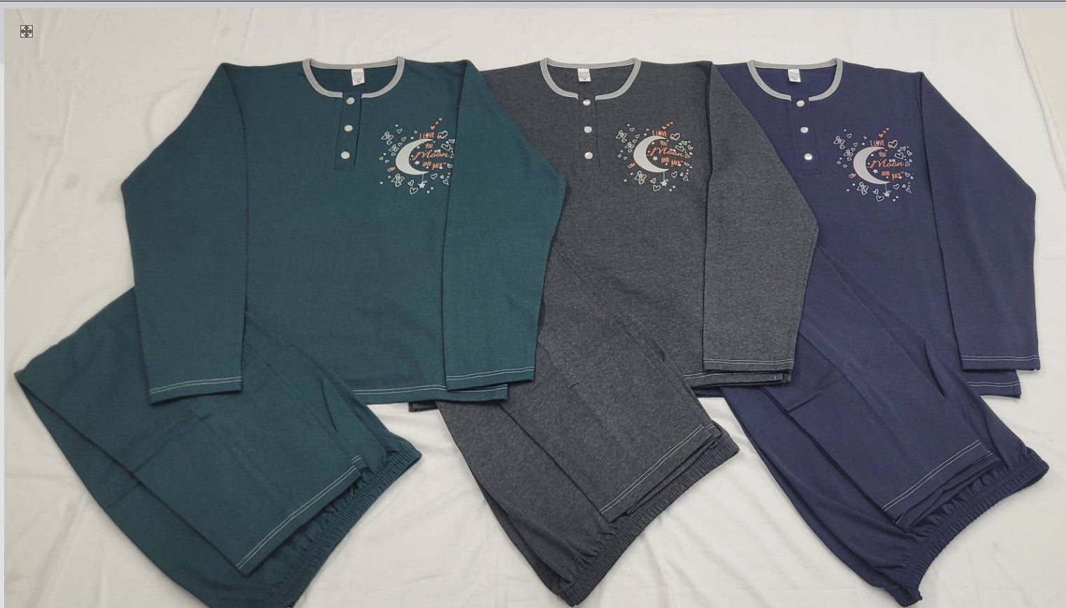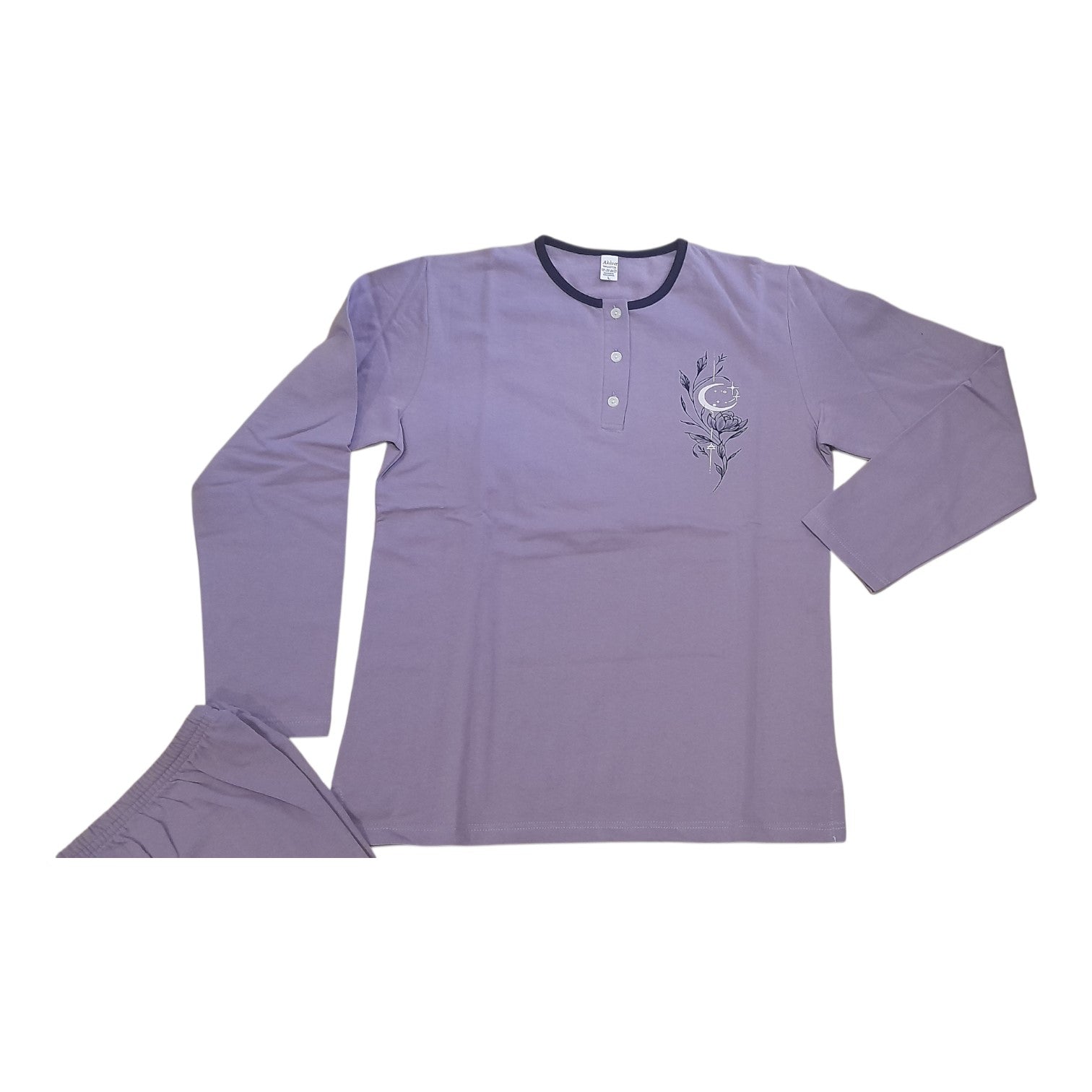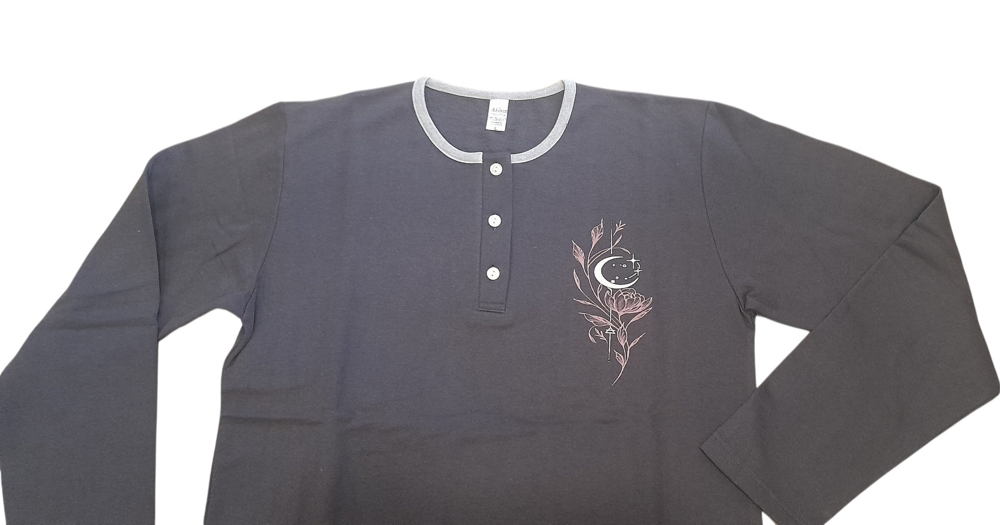 Βαμβακερή πιτζάμα γυναικών, φούτερ. Ελαφρύ, άνετο και κομψό homewear για κάθε ώρα ξεκούρασης, χαλάρωσης στο σπίτι. Λαιμόκοψη με 4 κουμπιά στην πατιλέτα