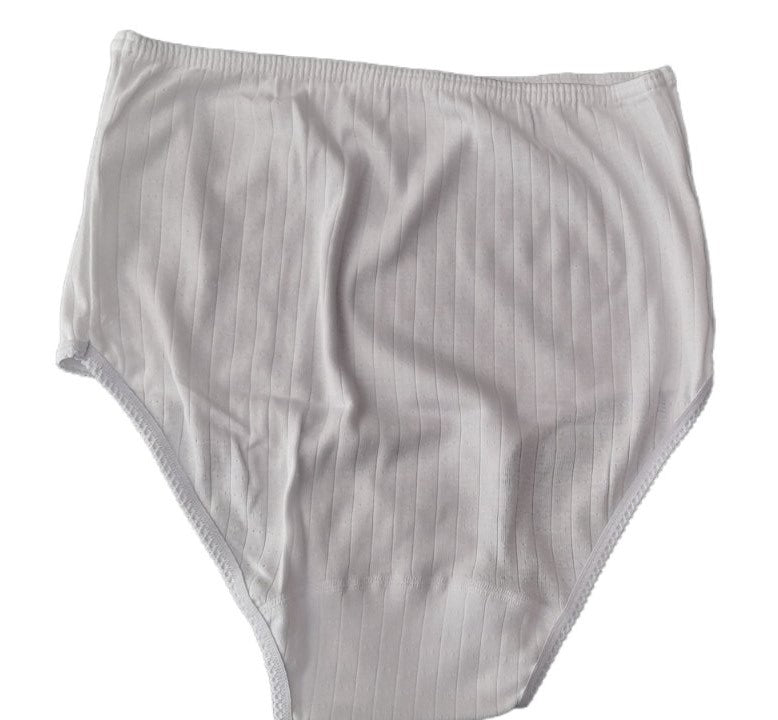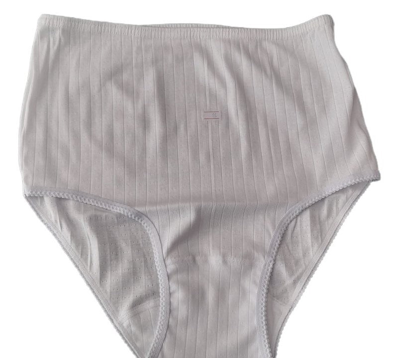 100% βαμβάκι, μόνο σε λευκό χρώμα. Ολόσωμη κυλότα σε διάταξη (τύπου μινέρβα) με εσωτερικό (περαστό) λάστιχο στη μέση και ντυμένο λαστιχάκι στο πόδι. Η κλασική λύση για μεγαλύτερες κυρίες, που προσφέρει απόλυτη άνεση και ασφάλεια