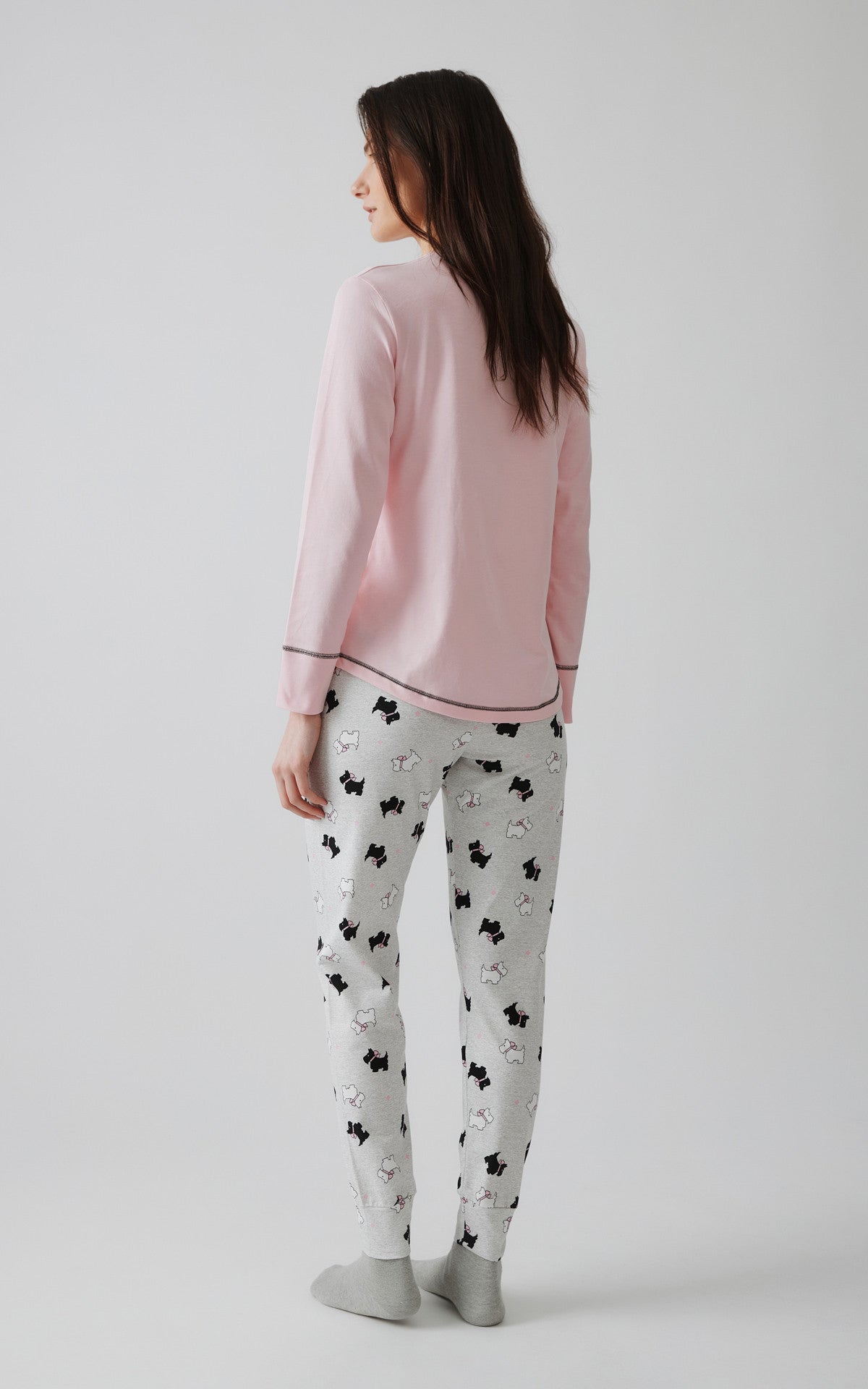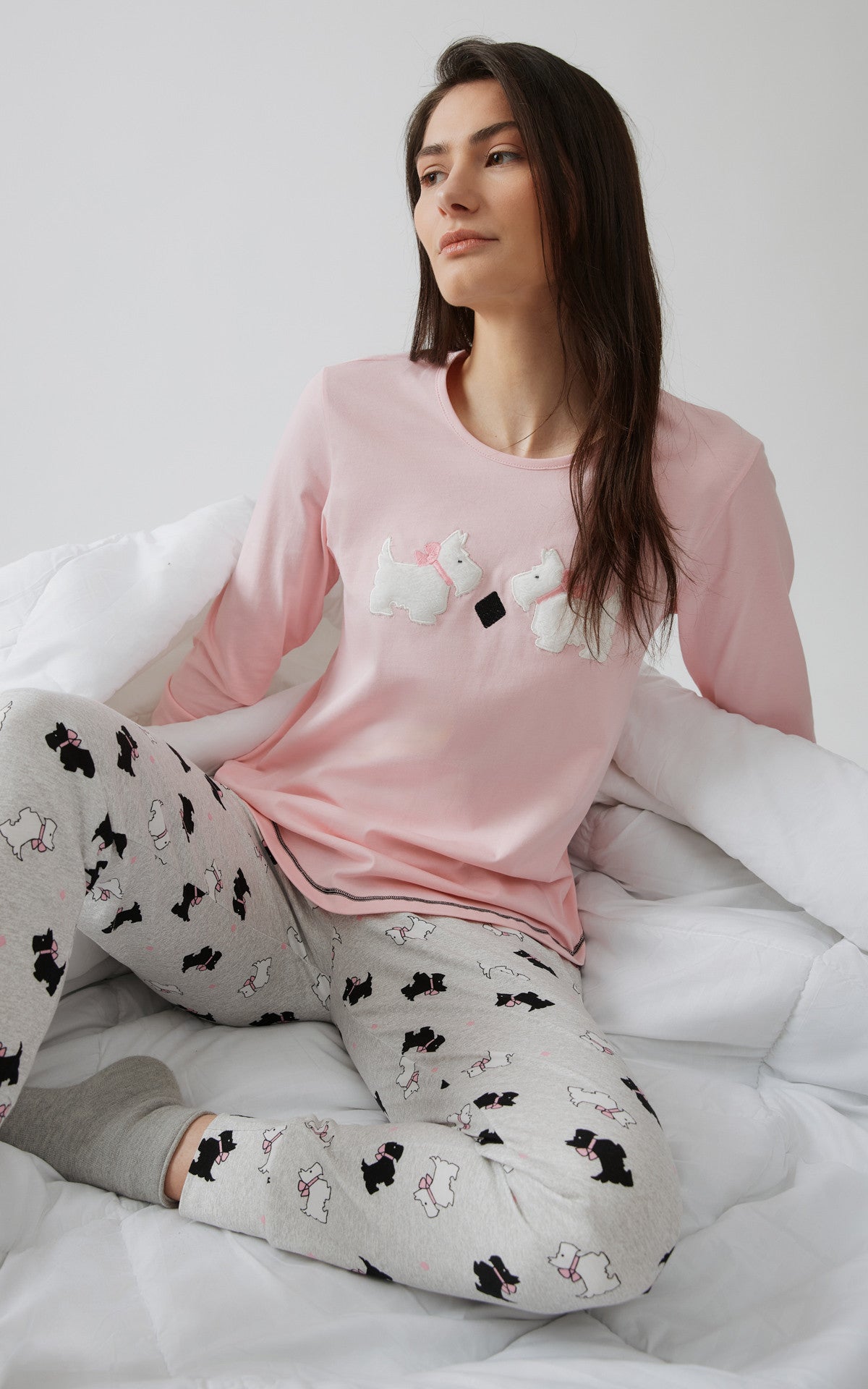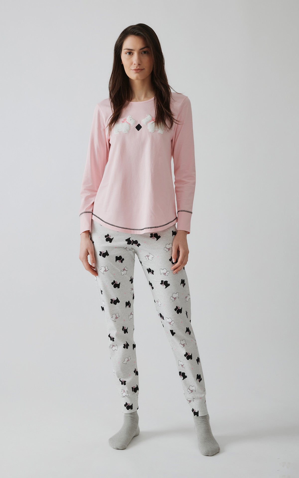 Χειμερινή πυζάμα από 100% βαμβακερό ύφασμα, υψηλής ποιότητας. Το σετ περιλαμβάνει μπλούζα μακρυμάνικη, με στρογγυλή λαιμόκοψη, κέντημα στο στήθος και τυπωμένο παντελόνι με μπάσκες στα τελειώματα.